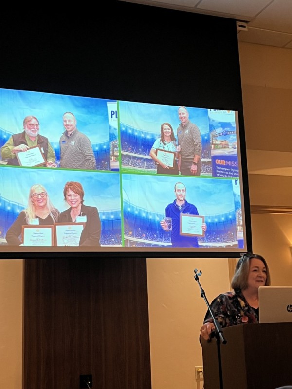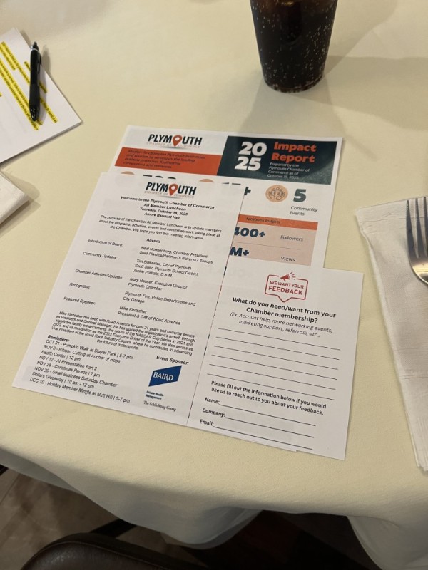 During the luncheon, the Plymouth Chamber shared information on upcoming and past events, sponsorship opportunities, and advertising in the 2026 Visitor & Resident Guide. The City of Plymouth provided updates on street construction projects and upcoming timelines, while the Plymouth School District highlighted their four pillars and ongoing focus on safety. Finally, the Downtown Arts & Merchants (D.A.M.) shared exciting upcoming events, including Queen for a Day and Charming Downtown Christmas.